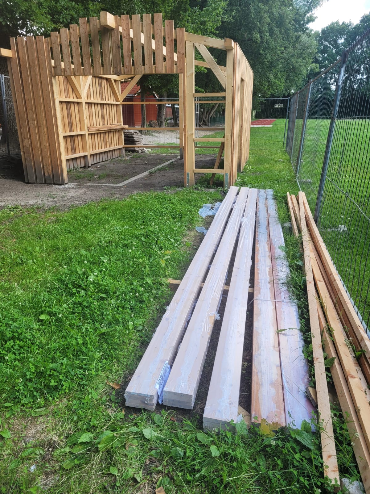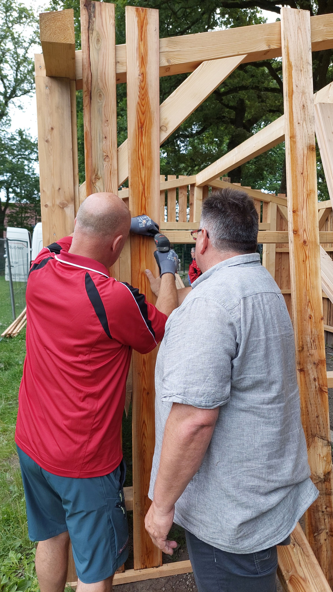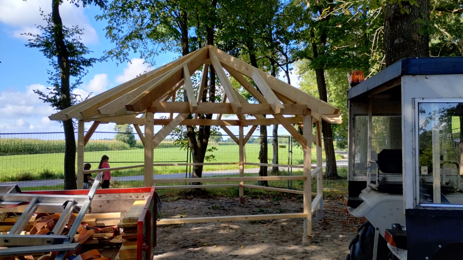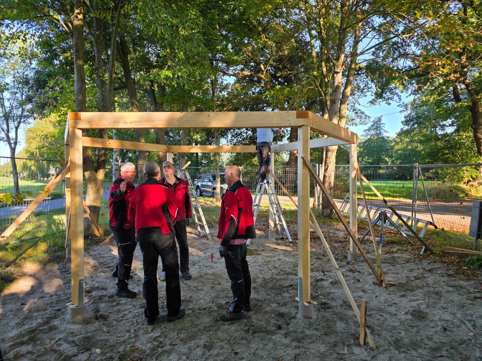 Im Auftrag der Gemeinde Hesel errichten die Spillwarker ab Juni 2025 eine großzügige Holzhütte auf dem Sportplatz der Grundschule Hesel. Die bisherige Holzhütte war abgängig und musste abgerissen werden. Nach Einrichtung der Baustelle und der Anlieferung des Bausatzes wurden die Punktfundamente erstellt. Nachdem der Bausatz montiert war wurden die Holzwände erstellt. Mit der Montage des Daches sind die Arbeiten für die Spillwarkers im September 2025 abgeschlossen. Die Fenster und Türen wurden von einer Fachfirma eingebaut und die Pflasterung erfolgte durch den Bauhof der Gemeinde.